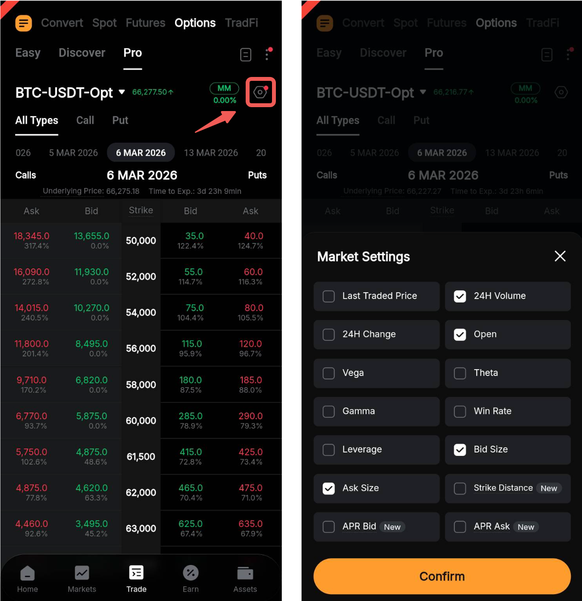 Untuk menyesuaikan pengaturan pasar di Rantai Opsi Anda, ketuk ikon Pengaturan dan pilih atau batalkan pilihan opsi sesuai kebutuhan. Pengaturan yang tersedia meliputi Harga Trading Terakhir, Opsi Yunani, Jarak Strike, APR Penawaran/Permintaan, dan lainnya.