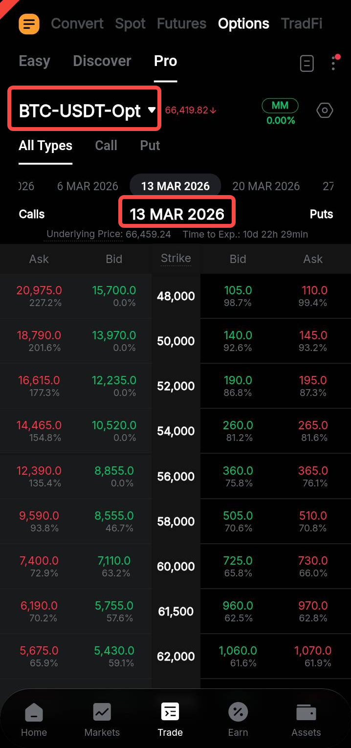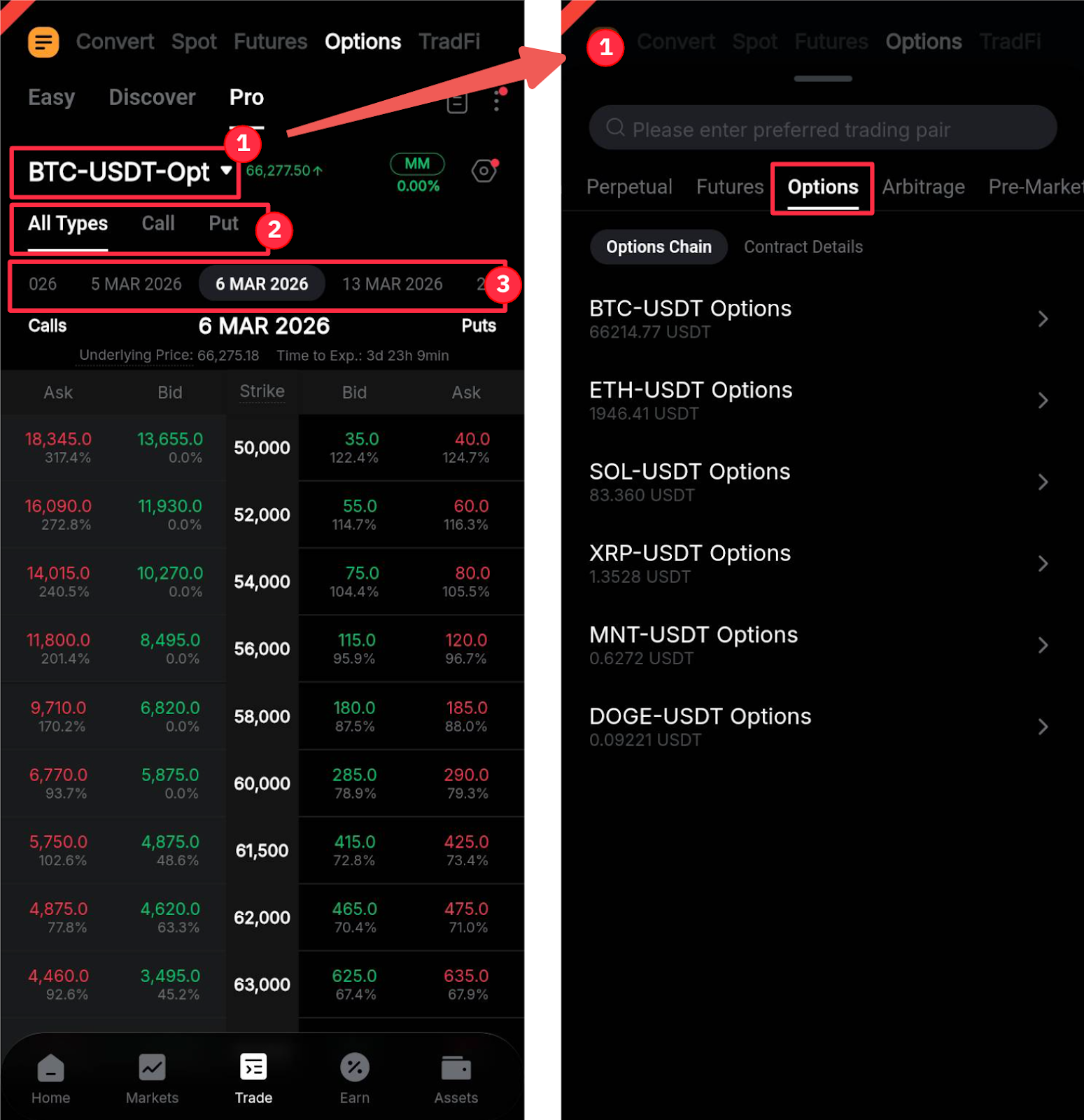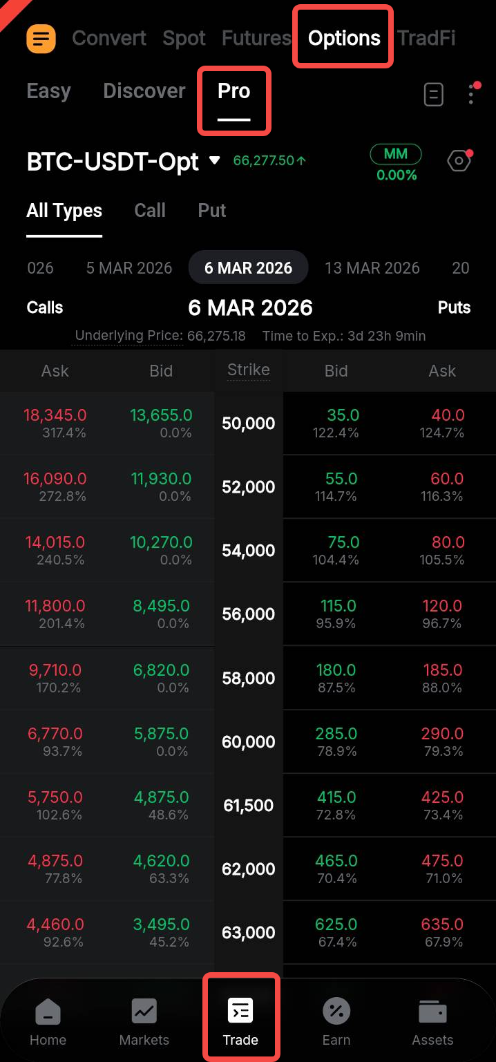 Di beranda Aplikasi Bybit, buka Trade dan beralih ke tab Opsi di panel navigasi atas.