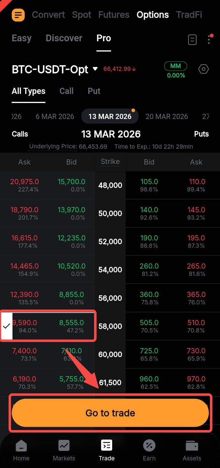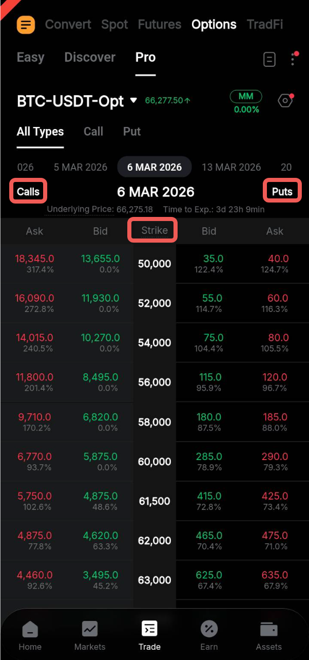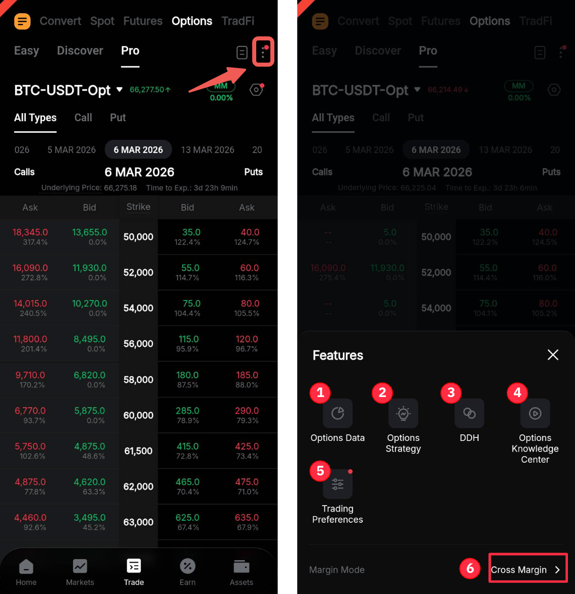 Di beranda Aplikasi Bybit, buka Trade dan beralih ke tab Opsi di panel navigasi atas.