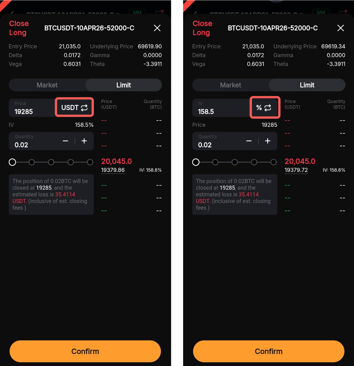2. Masukkan harga pesanan atau IV (%). Ketuk ikon Beralih untuk beralih di antara kedua parameter.