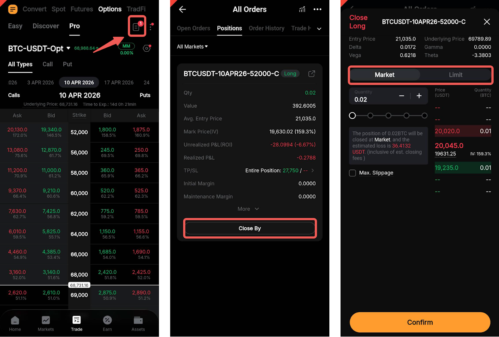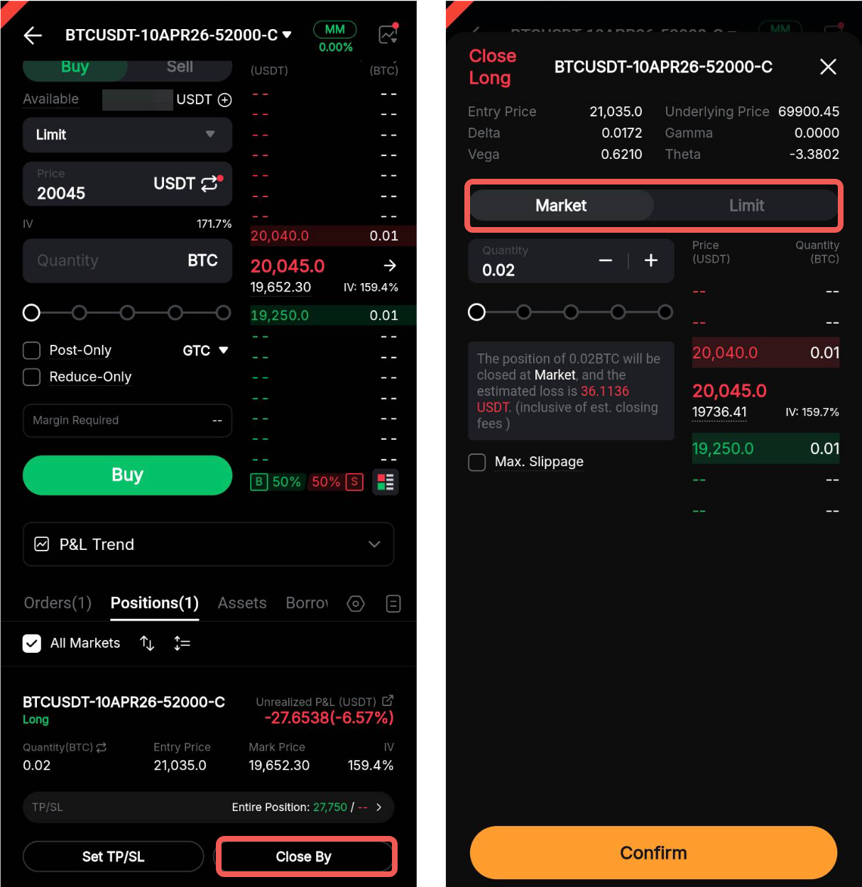 Misalnya, jika Anda memiliki posisi Beli Call aktif sebesar 1 BTCUSDT-24FEB26-62000-C, Anda harus menempatkan pesanan Jual Call untuk 1 BTCUSDT-24FEB26-62000-C untuk menutup posisi sepenuhnya.