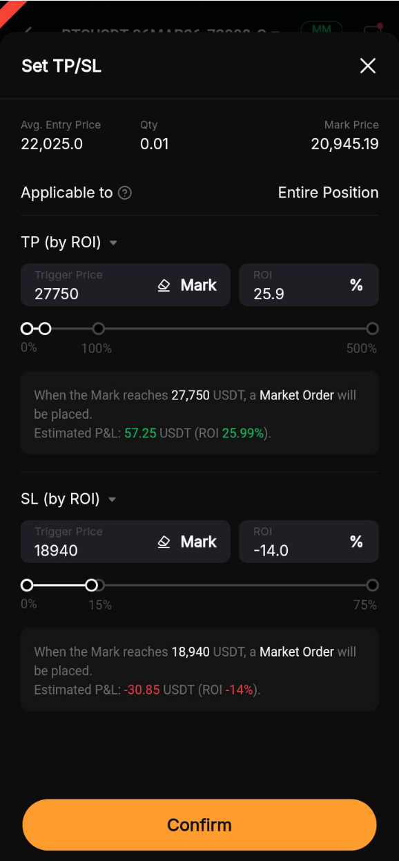 Langkah 2: Di jendela Modifikasi TP/SL, perbarui parameter TP/SL sesuai kebutuhan, lalu ketuk Konfirmasi.