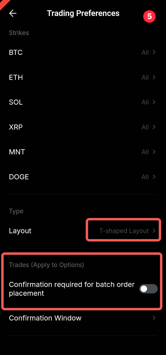 5. Preferensi Trading: Sesuaikan preferensi trading Anda dan tata letak Rantai Opsi. Anda juga dapat mengaktifkan penempatan pesanan batch untuk pesanan Opsi multi-leg.