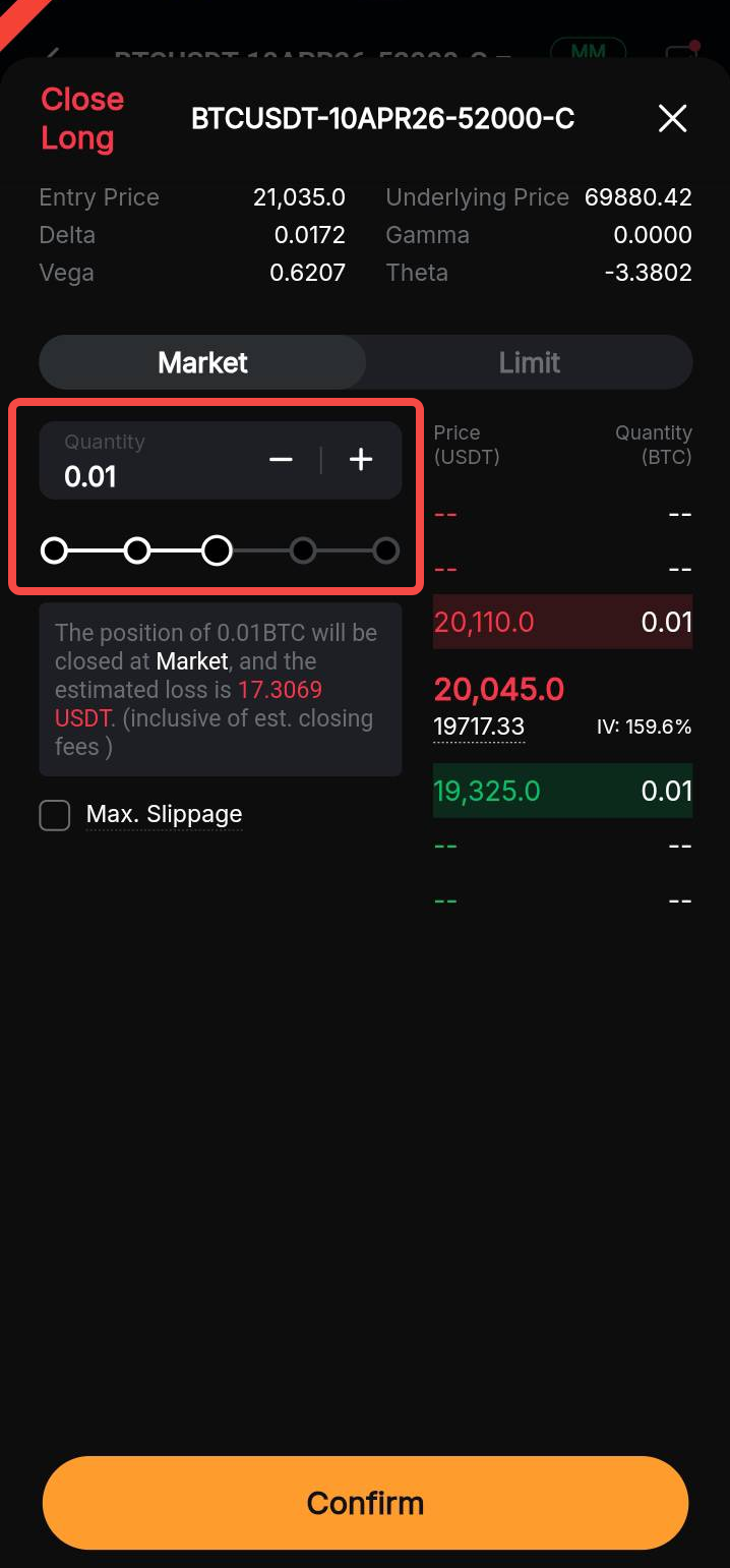 Untuk menutup sebagian posisi, sesuaikan kuantitas menggunakan bilah geser atau kolom input. Harap diperhatikan bahwa penutupan sebagian hanya tersedia jika ukuran posisi Anda melebihi kuantitas pesanan minimum.