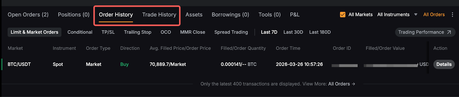 Anda dapat beralih ke tab Riwayat Pesanan atau Riwayat Trading di halaman Trading Spot untuk melihat hingga 400 catatan dari enam (6) bulan terakhir. Mirip dengan Pesanan Saat Ini, Anda dapat mencentang kotak Semua Pasar untuk melihat riwayat pesanan atau riwayat trading dari semua pasangan trading dan pilih Hanya Spot di menu Instrumen untuk hanya melihat pesanan dan trading Spot yang lalu.