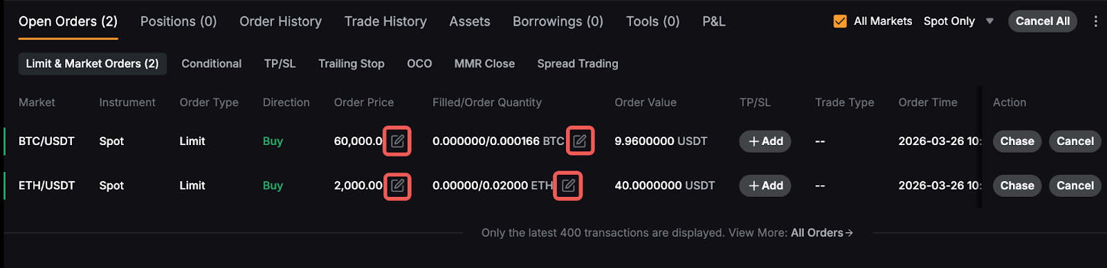Klik ikon pensil di samping parameter pesanan Anda untuk mengubah detail seperti harga pesanan, harga pemicu, atau kuantitas pesanan Anda.