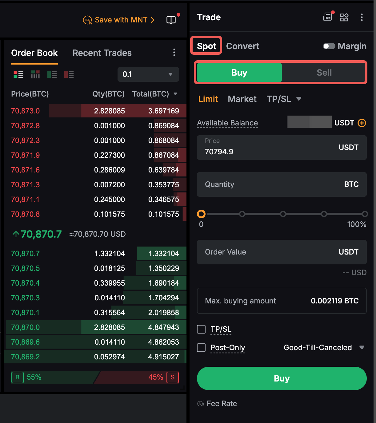 Langkah 1: Untuk melakukan Perdagangan Spot, pastikan Anda berada di tab Spot. Kemudian, pilih untuk Beli atau Jual aset.