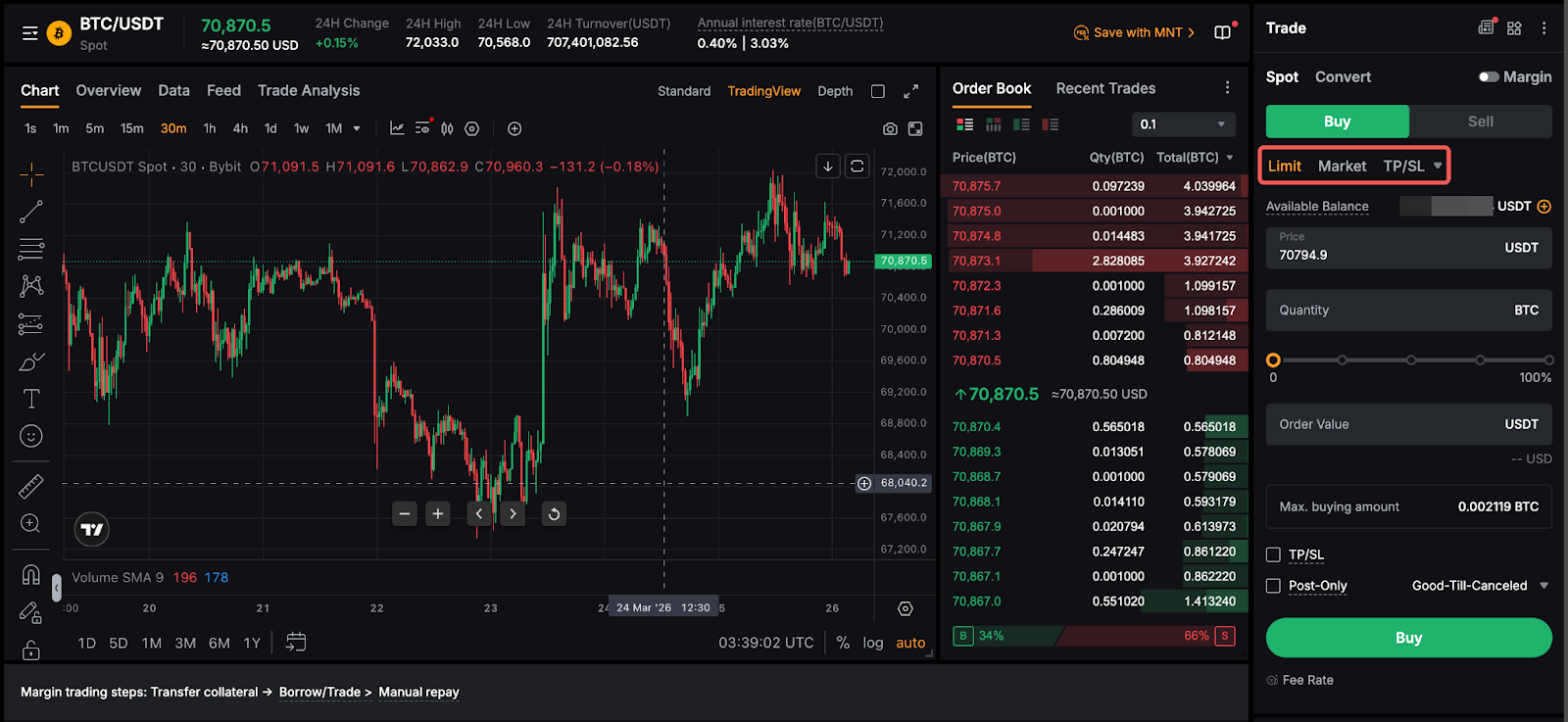 Perdagangan Spot Bybit menyediakan Anda berbagai jenis pesanan. Untuk pelajari selengkapnya tentang perbedaan antara setiap jenis pesanan, silakan lihat Jenis Pesanan yang Tersedia di Bybit.
