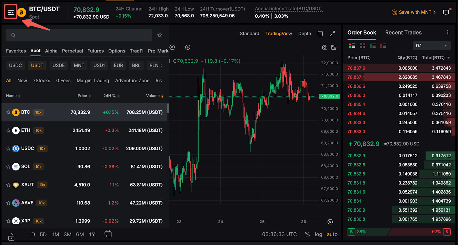 Di sisi kiri halaman, arahkan kursor Anda pada menu tarik turun di samping pasangan perdagangan, dan Anda akan melihat semua pasangan perdagangan Spot yang didukung, termasuk Harga Terakhir Diperdagangkan dan persentase perubahan 24 jam pasangan perdagangan tersebut.