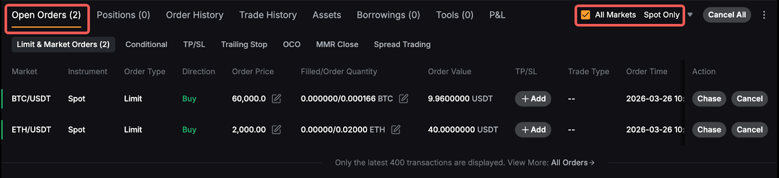Anda dapat melihat pesanan Anda saat ini yang belum terisi atau belum terpicu di tab Pesanan Terbuka. Untuk menampilkan semua pesanan saat ini di semua pasangan trading di semua produk yang tersedia, Anda dapat mencentang kotak Semua Pasar. Jika Anda ingin membatasi pilihan ke pasangan Trading Spot, cukup pilih Hanya Spot di menu Instrumen.