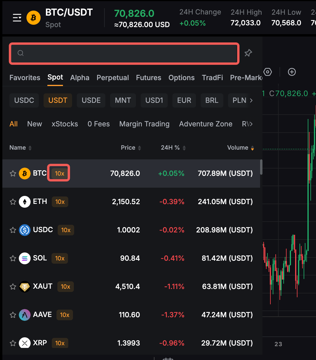Untuk menemukan pasangan perdagangan yang Anda inginkan dengan cepat, gunakan kotak pencarian untuk memasukkan pasangan perdagangan yang ingin Anda lihat. Jika Anda melihat label 10x di samping pasangan perdagangan tertentu, itu menunjukkan bahwa pasangan perdagangan tersebut didukung dalam Perdagangan Margin Spot.