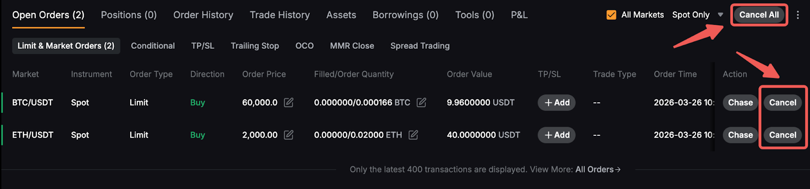 Untuk membatalkan pesanan Spot, buka tab Pesanan Saat Ini dan klik Batalkan. Atau, Anda dapat memilih untuk Batalkan Semua pesanan dari sudut kanan atas. Harap dicatat bahwa jika Anda telah memilih opsi Semua Pasar, mengeklik Batalkan Semua akan membatalkan pesanan dari semua pasangan perdagangan.