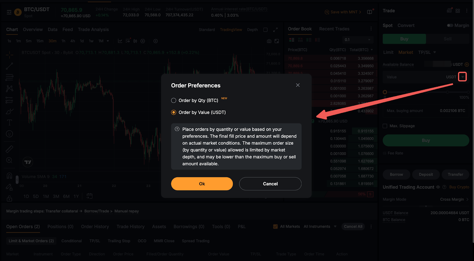 Untuk pesanan beli dan jual pasar, pengaturan defaultnya adalah membuat pesanan berdasarkan nilai (beli pasar) dan berdasarkan kuantitas (jual pasar). Anda dapat mengeklik Pesan berdasarkan Nilai atau Pesan berdasarkan Kuantitas untuk mengubah preferensi pembuatan pesanan Anda.