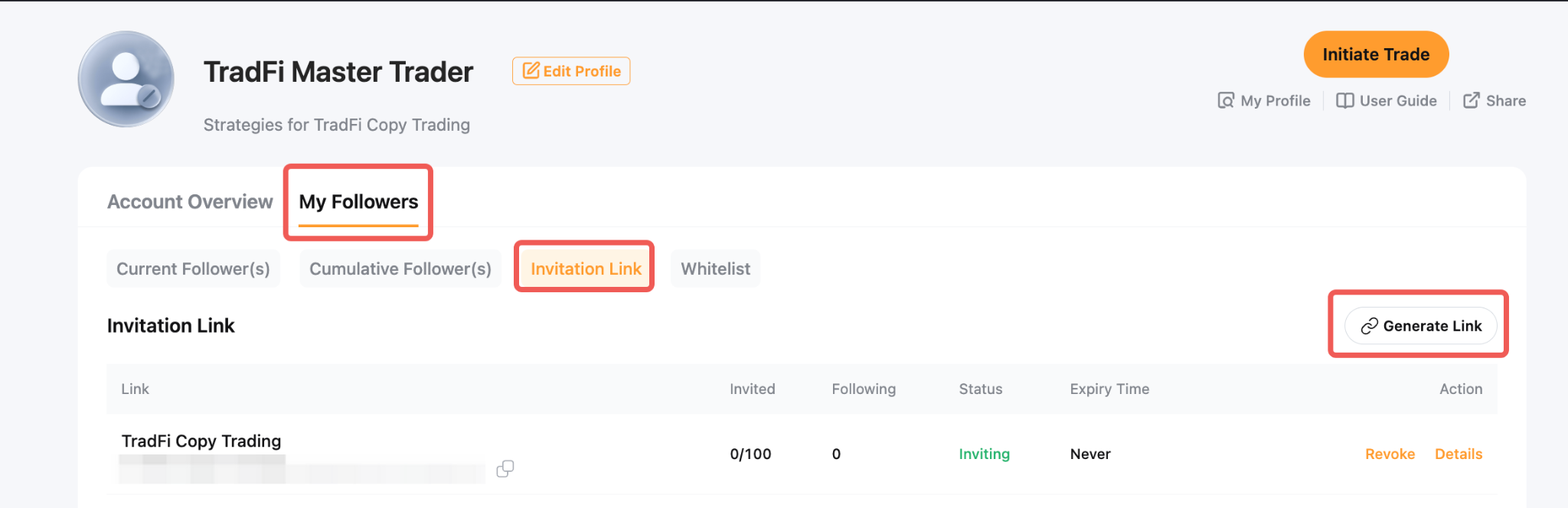 As a Master Trader, you can generate a unique invitation link that allows Followers to copy your trades directly without additional confirmation. If the Follower Whitelist is enabled, Followers who join through the invitation link will be automatically added to the whitelist.