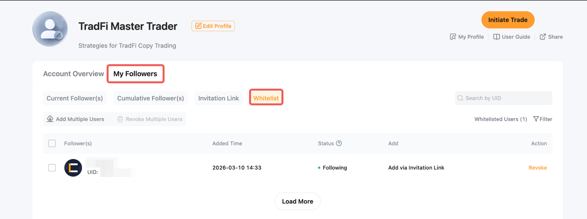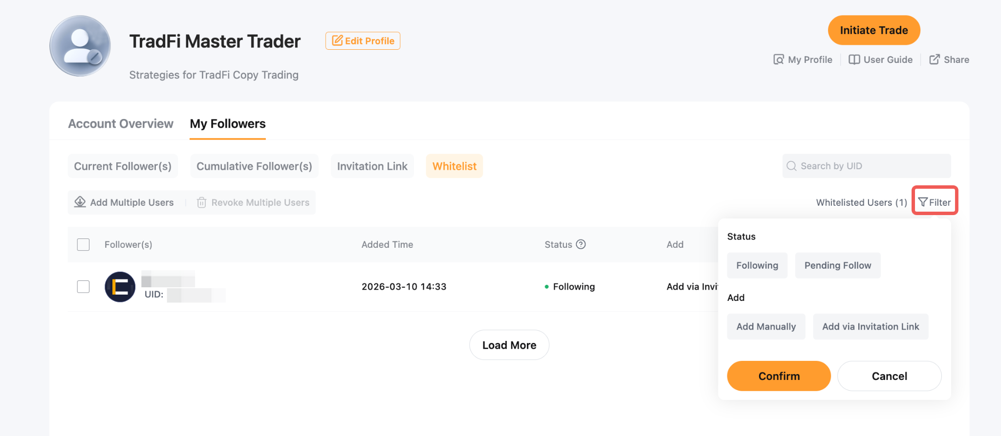 Copy Trading TradFi provides two features — Invitation Link and Follower Whitelist — that allow Master Traders to manage who can follow their trades.