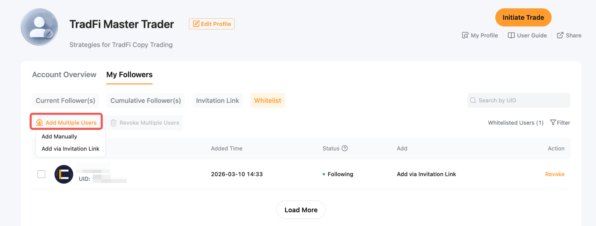 The Follower Whitelist feature gives you full control over who can copy your trades. You can add specific Followers in batches and customize their profit-sharing and investment settings.