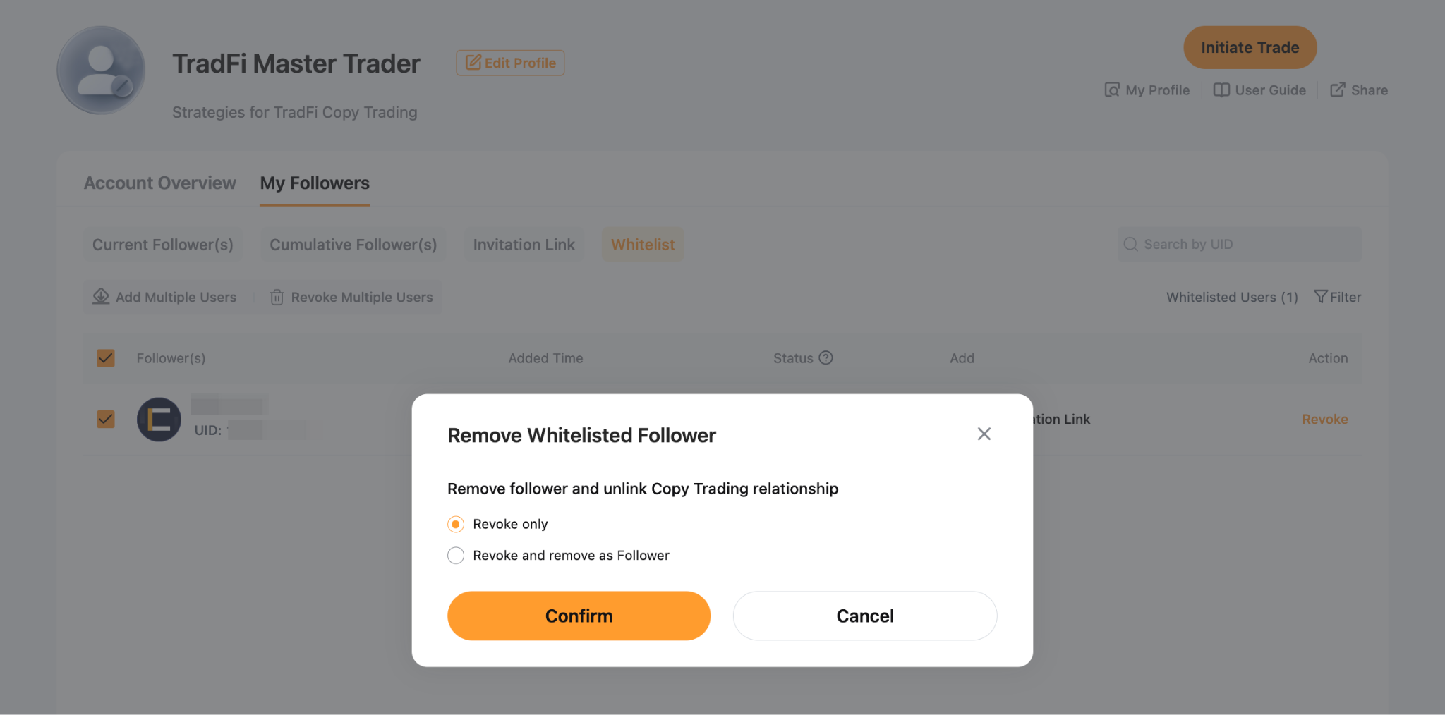 2. Revoke only: Removes the user from your whitelist while allowing them to continue copying the existing trades until they unfollow. Once they unfollow, they will no longer be able to follow you unless they are re-added to the whitelist.