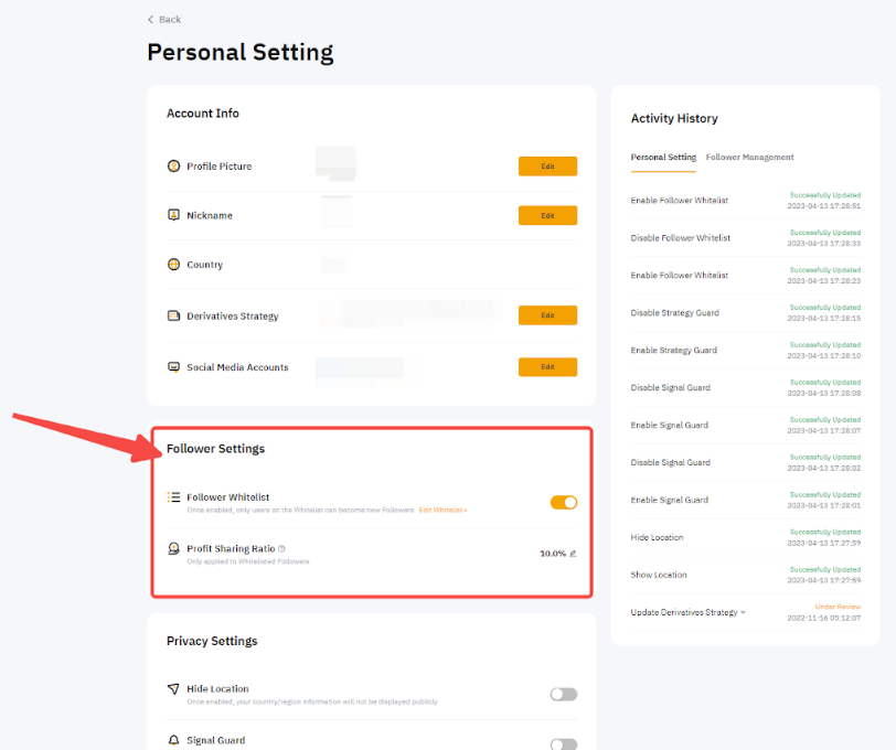 To enable your Follower Whitelist, go to User Center (Master Trader) → Personal Settings → Follower Settings, and toggle on the Follower Whitelist option.