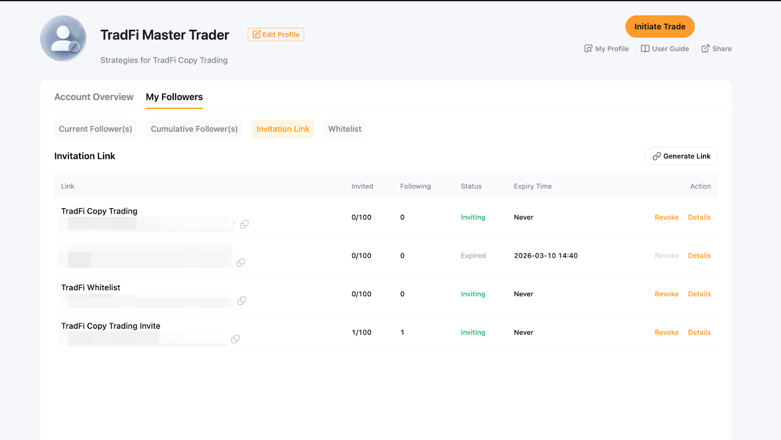 Sebagai Master Trader, Anda dapat membuat tautan undangan unik yang memungkinkan Pengikut untuk menyalin perdagangan Anda secara langsung tanpa konfirmasi tambahan. Jika Daftar Putih Pengikut diaktifkan, Pengikut yang bergabung melalui tautan undangan akan secara otomatis ditambahkan ke daftar putih.