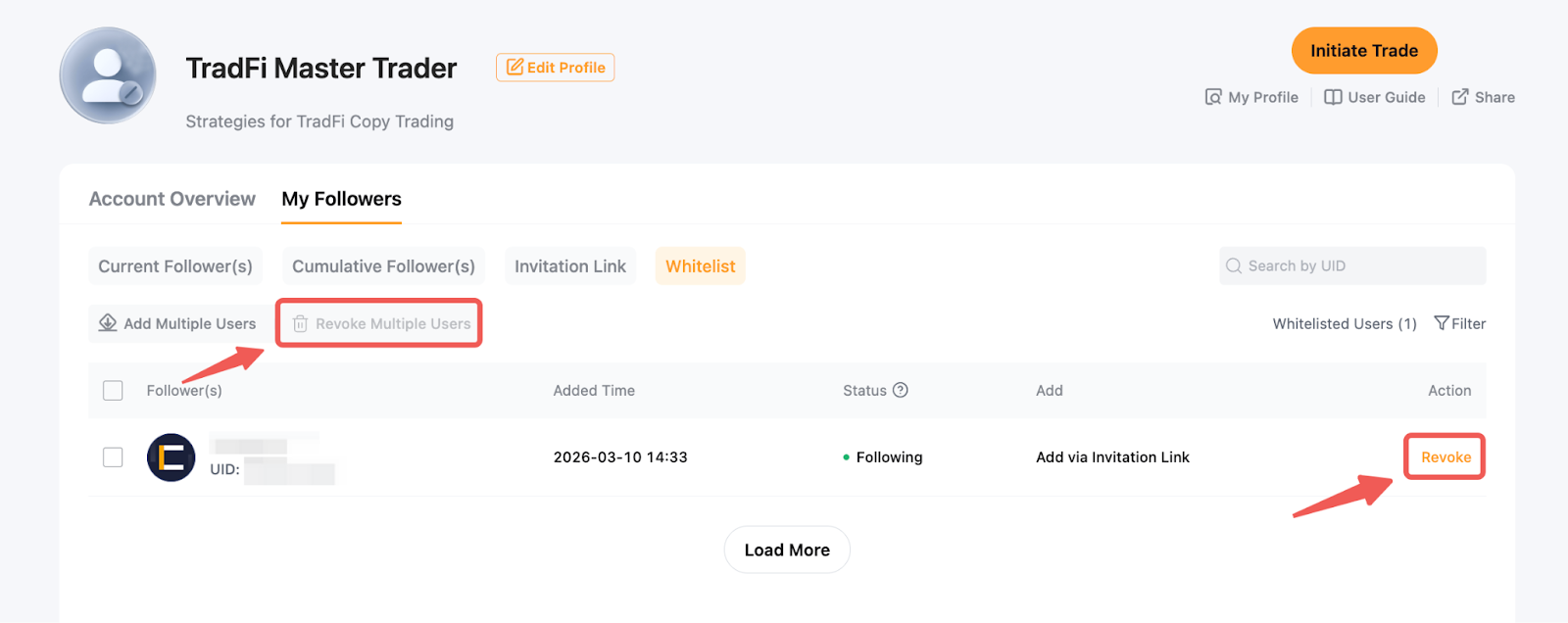 Copy Trading TradFi menyediakan dua fitur — Tautan Undangan dan Daftar Putih Pengikut — yang memungkinkan Master Trader untuk mengelola siapa saja yang dapat mengikuti perdagangan mereka.