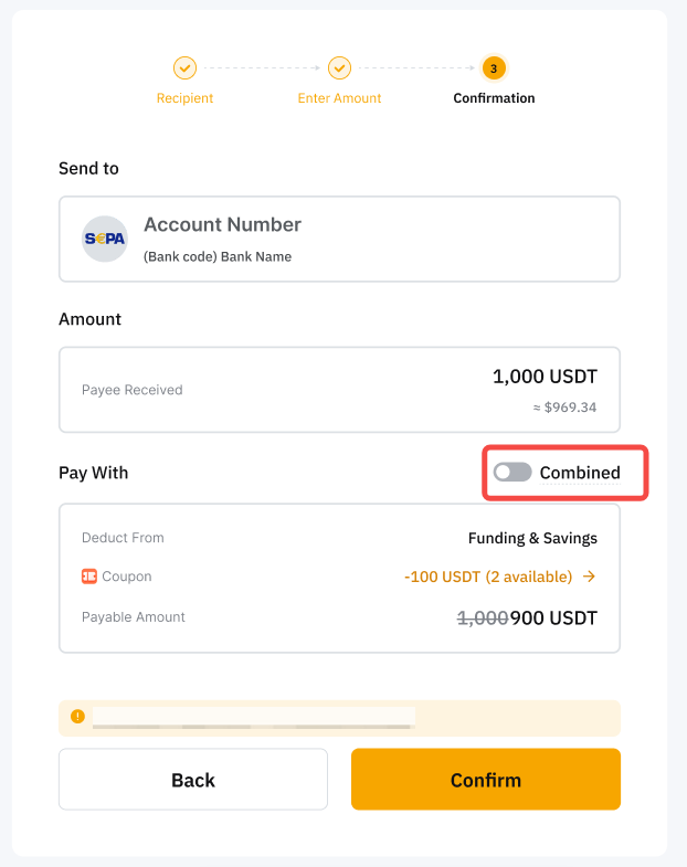 Pembayaran kombinasi hanya mendukung pembayaran dalam USDT dan jika akun Pendanaan Anda tidak memiliki cukup USDT, dana dari akun Earn Anda akan digunakan berdasarkan prioritas pembayaran yang Anda tetapkan.