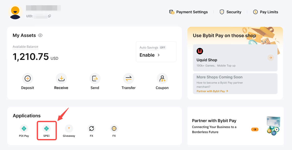 Langkah 1: Buka halaman Bybit Pay dengan menekan Keuangan → Bybit Pay. Kemudian, klik SPEI (untuk Transfer SPEI) untuk membuka antarmuka transfer dan memulai transfer Anda.