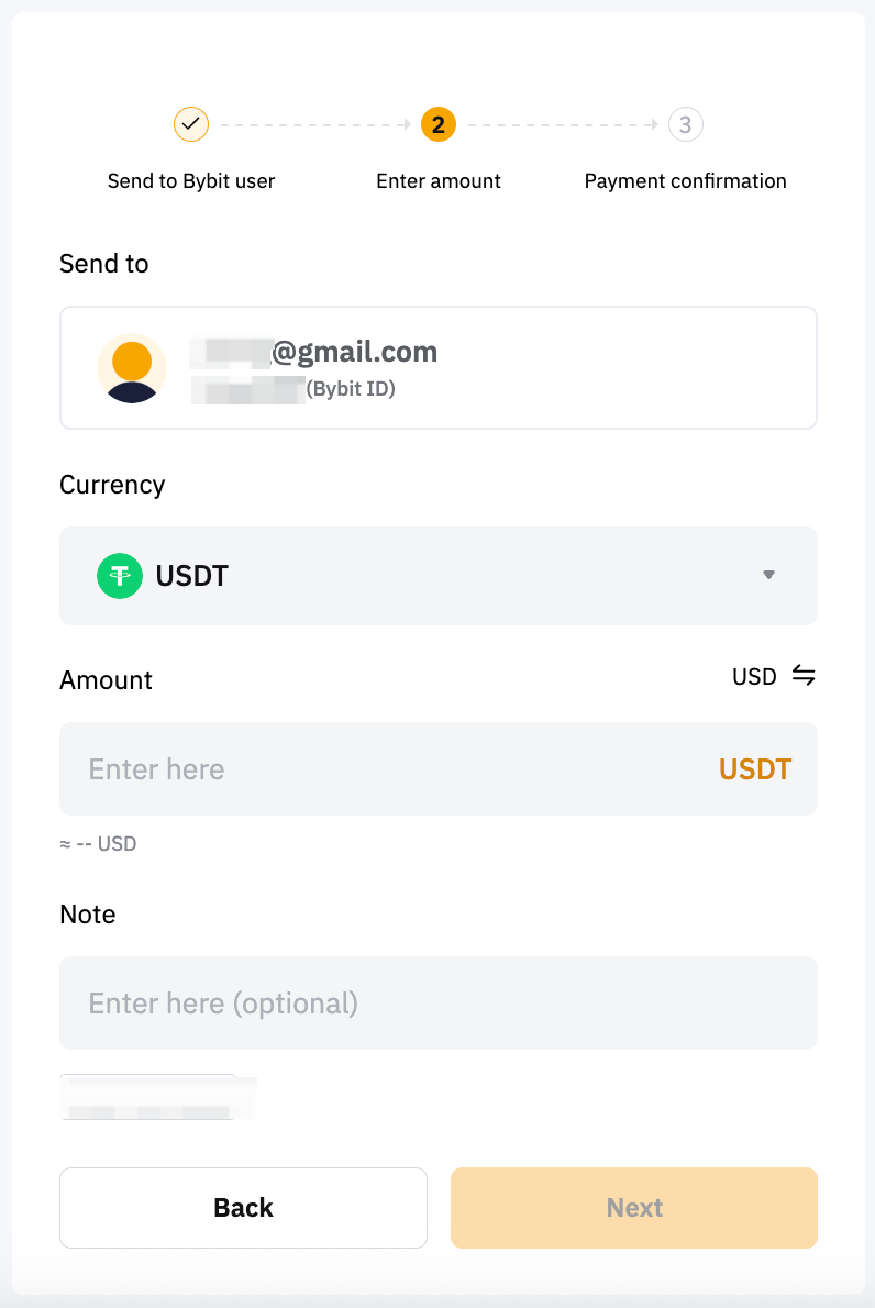 Langkah 2: Pilih jenis metode pembayaran transfer internal. Anda dapat mengirimkan pembayaran kepada pengguna Bybit Pay lainnya dengan memasukkan: