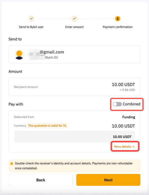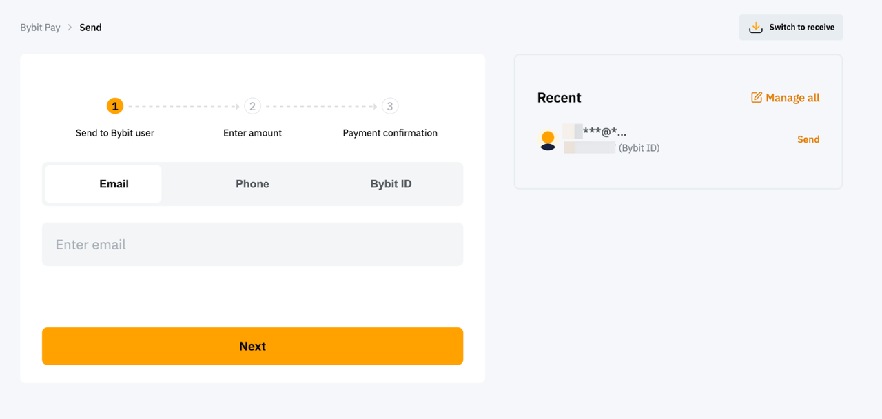 Transfer Internal Bybit Pay memungkinkan anda mengirim fiat secara instan dan penerima akan menerima kripto, atau mengirim kripto dan penerima akan menerima aset kripto atau fiat — semuanya dengan nol biaya transaksi. Saat ini, pengiriman fiat melalui fitur ini hanya tersedia di Aplikasi Bybit. Dukungan web akan segera diluncurkan.