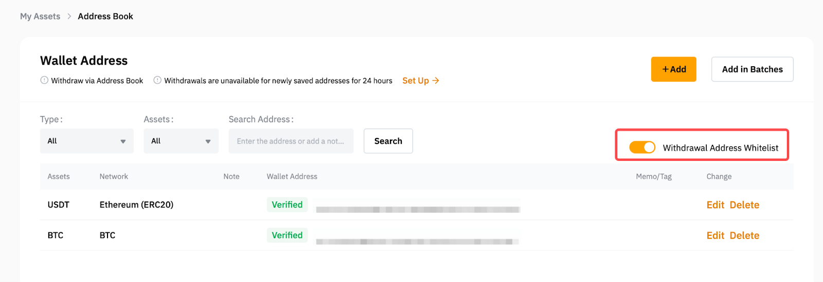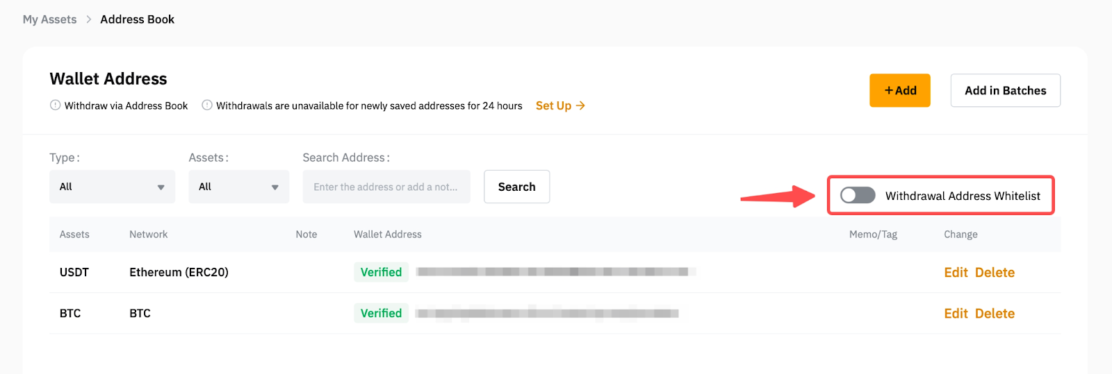 Langkah 5: Setelah verifikasi alamat dompet selesai, silakan aktifkan fungsi Daftar Putih Alamat Penarikan di sudut kanan atas halaman untuk memasukkan alamat dompet terverifikasi ke dalam fungsi penarikan Anda.