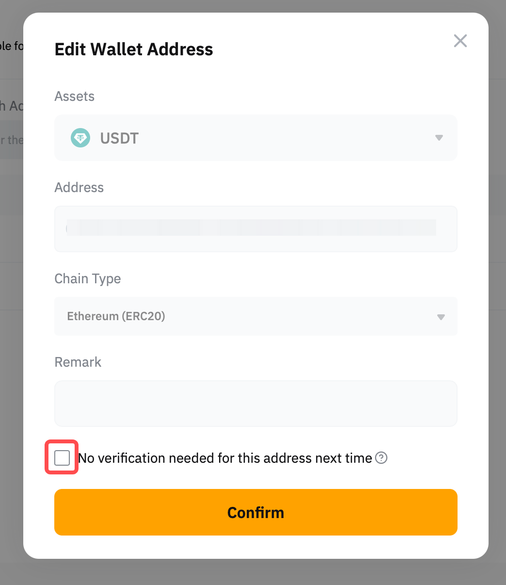 Langkah 3: Masukkan informasi koin, blockchain, dan alamat dompet yang benar untuk dompet penarikan Anda dan centang opsi Verifikasi tidak diperlukan untuk alamat ini lain kali. Klik Konfirmasi setelah Anda selesai.