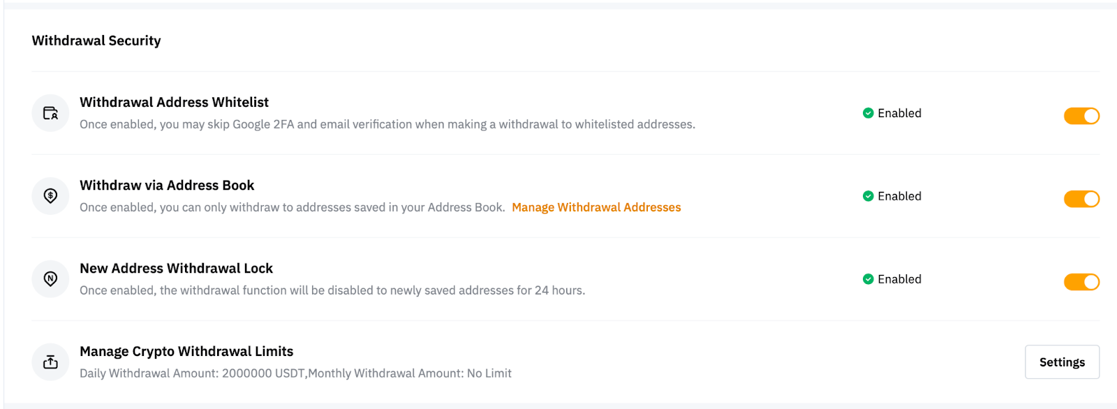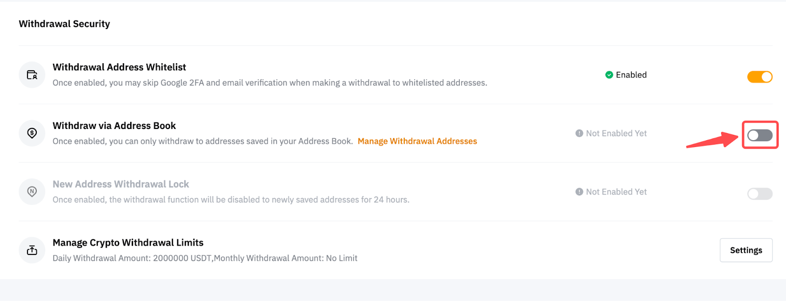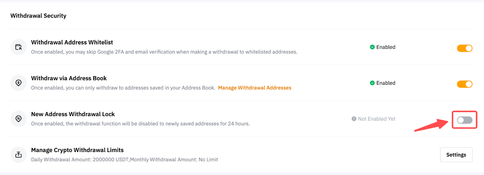 Fungsi Kunci Penarikan Alamat Baru akan menempatkan larangan penarikan pada semua alamat dompet baru yang ditambahkan ke buku alamat penarikan Anda. Penguncian ini tidak akan memengaruhi alamat yang ditambahkan setidaknya 24 jam sebelum aktivasi fungsi.