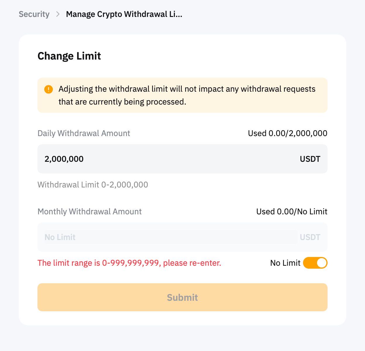 Untuk memiliki kontrol yang lebih baik atas penarikan Anda, Anda juga dapat mengatur batas penarikan kripto harian dan bulanan Anda sendiri. Cukup masukkan jumlah penarikan untuk setiap batas dan klik Kirim.