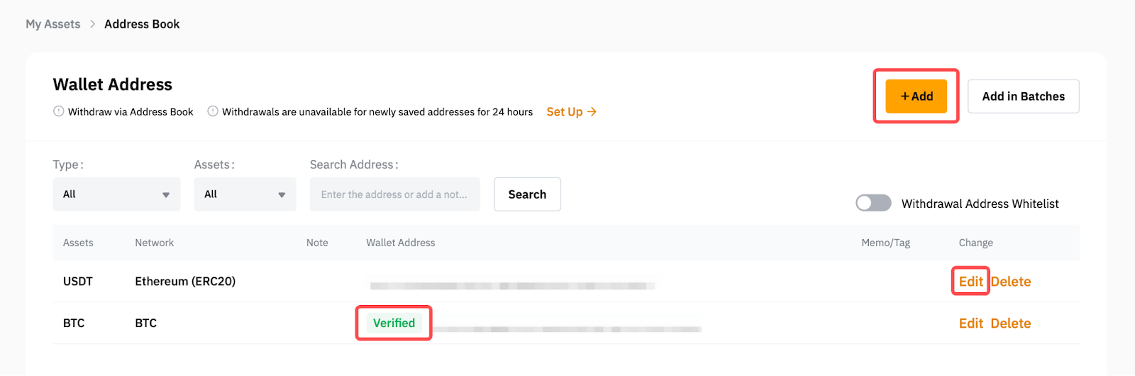 Langkah 2: Silakan klik Tambahkan di sudut kanan atas halaman untuk menambahkan alamat dompet baru, atau pilih alamat dompet yang ingin Anda verifikasi dengan mengeklik Edit.
