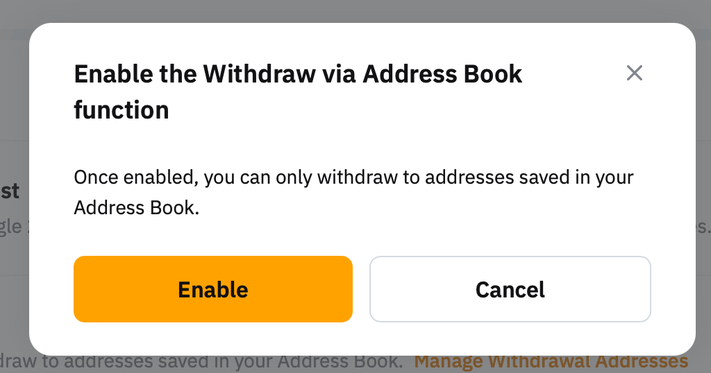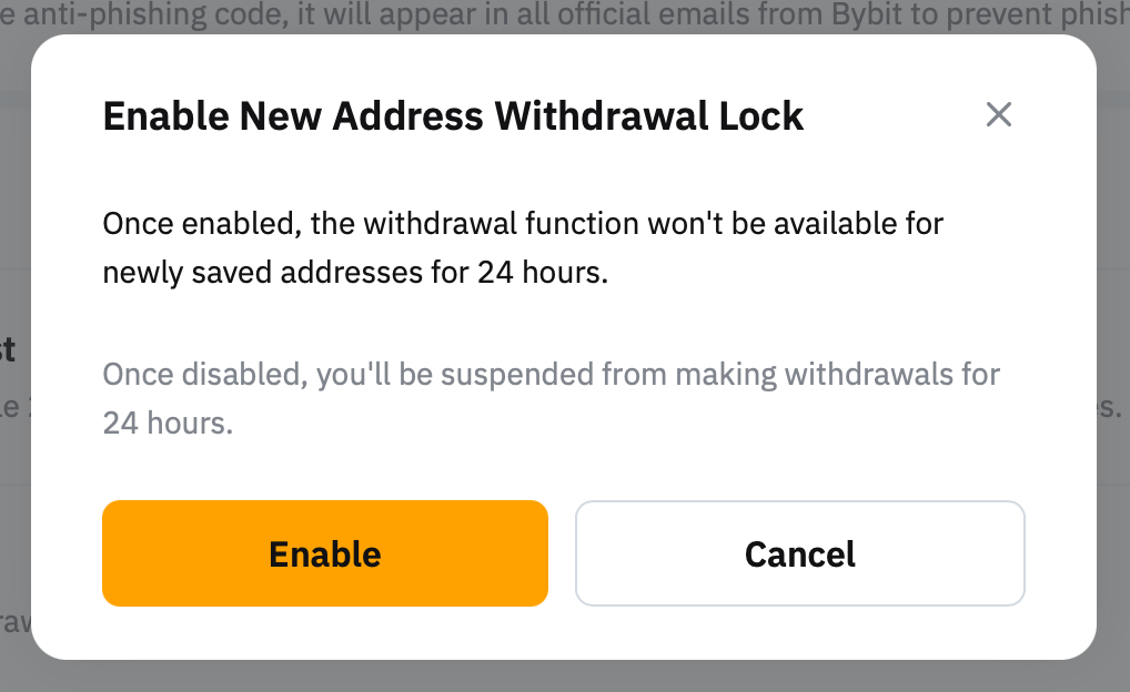 Langkah 2: Jendela pop-up akan terbuka untuk mengonfirmasi bahwa Anda ingin mengaktifkan fungsi Kunci Penarikan Alamat Baru. Klik Aktifkan.