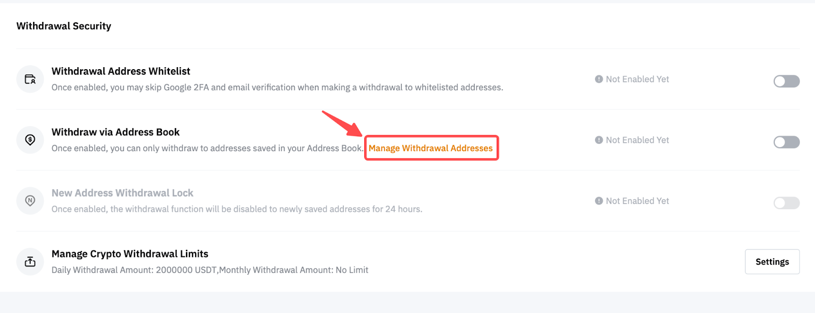 Langkah 1: Untuk memulai, buka tautan manajemen dompet yang disediakan di sini, atau klik Pengaturan atau Kelola Alamat Penarikan di Halaman Keamanan Akun.