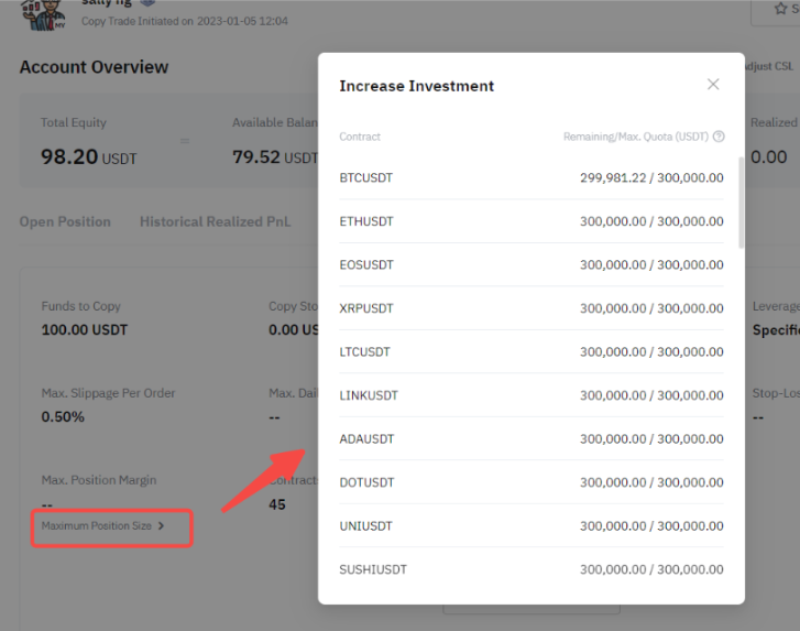 Ukuran posisi maksimum menunjukkan sisa dan nilai pesanan maksimum yang dapat diikuti untuk copy trade, yang berasal dari ukuran posisi Anda (baik dalam arah long maupun short).