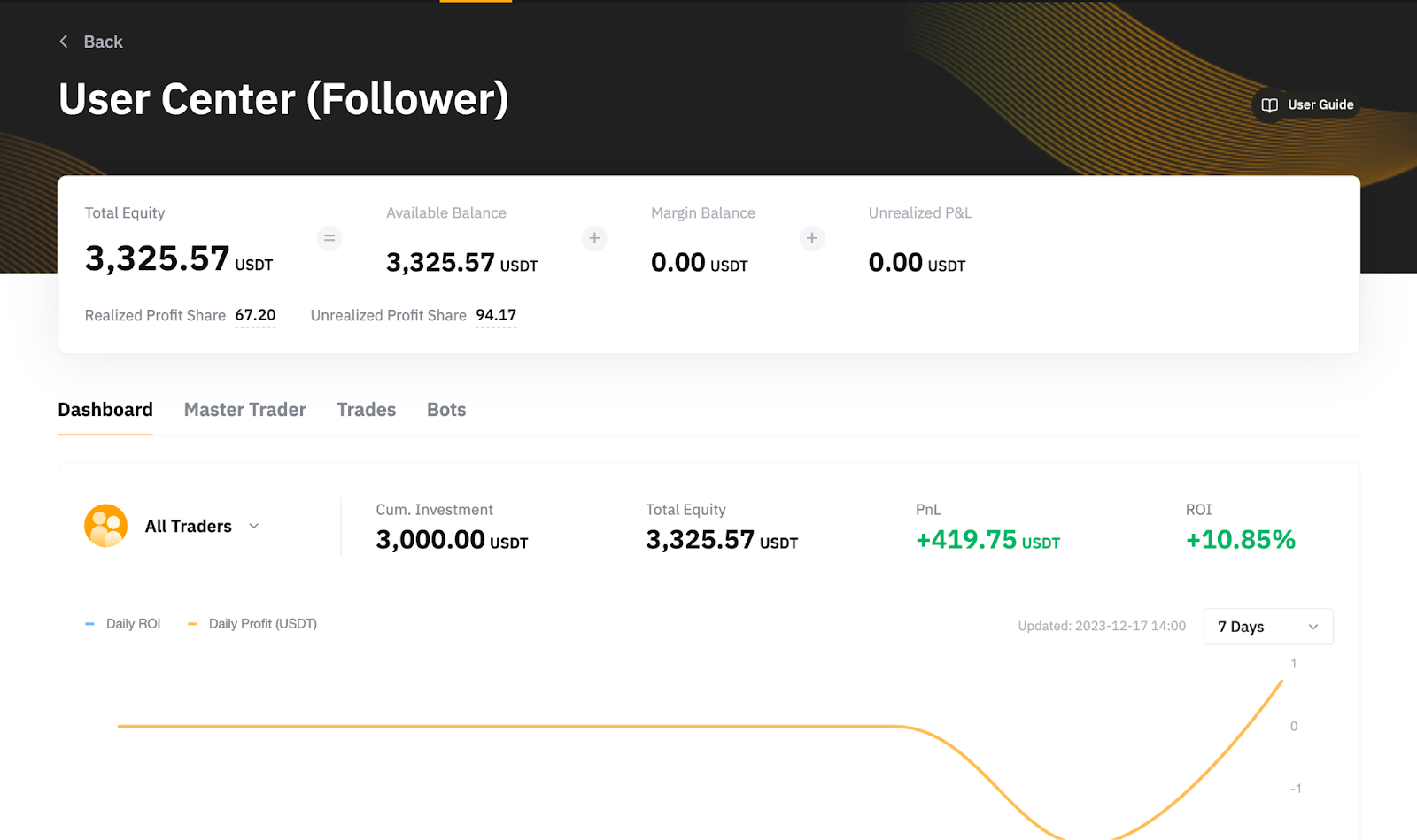 Melalui Pusat Pengguna Copy Trading (Pengikut), pengguna dapat melihat ikhtisar akun Copy Trading, kinerja Master Trader yang mereka ikuti di masa lalu atau saat ini, dan juga detail pesanan.