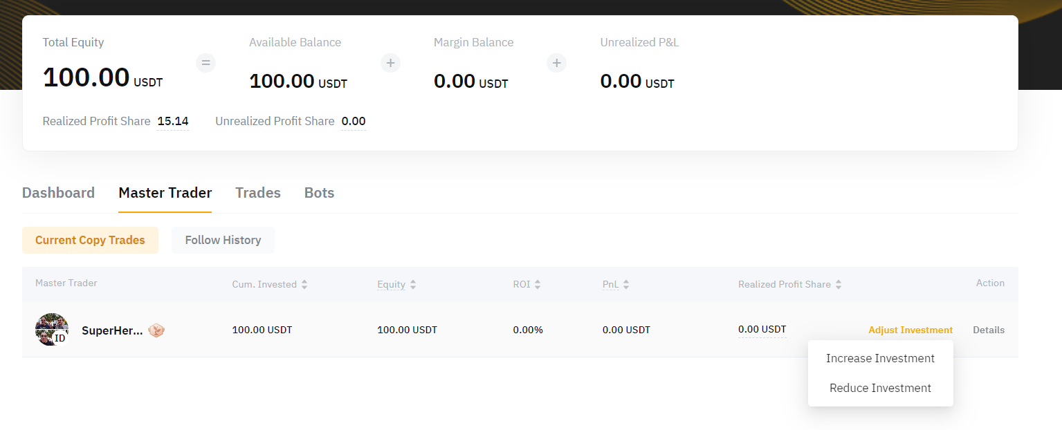 Di bagian ini, Anda dapat melihat Copy Trade Saat Ini,serta Riwayat Mengikuti dari Master Trader yang berbeda. Selain itu, Anda juga dapat meningkatkan dana yang digunakan untuk menyalin Master Trader dengan mengeklik tombol Tingkatkan Investasi.