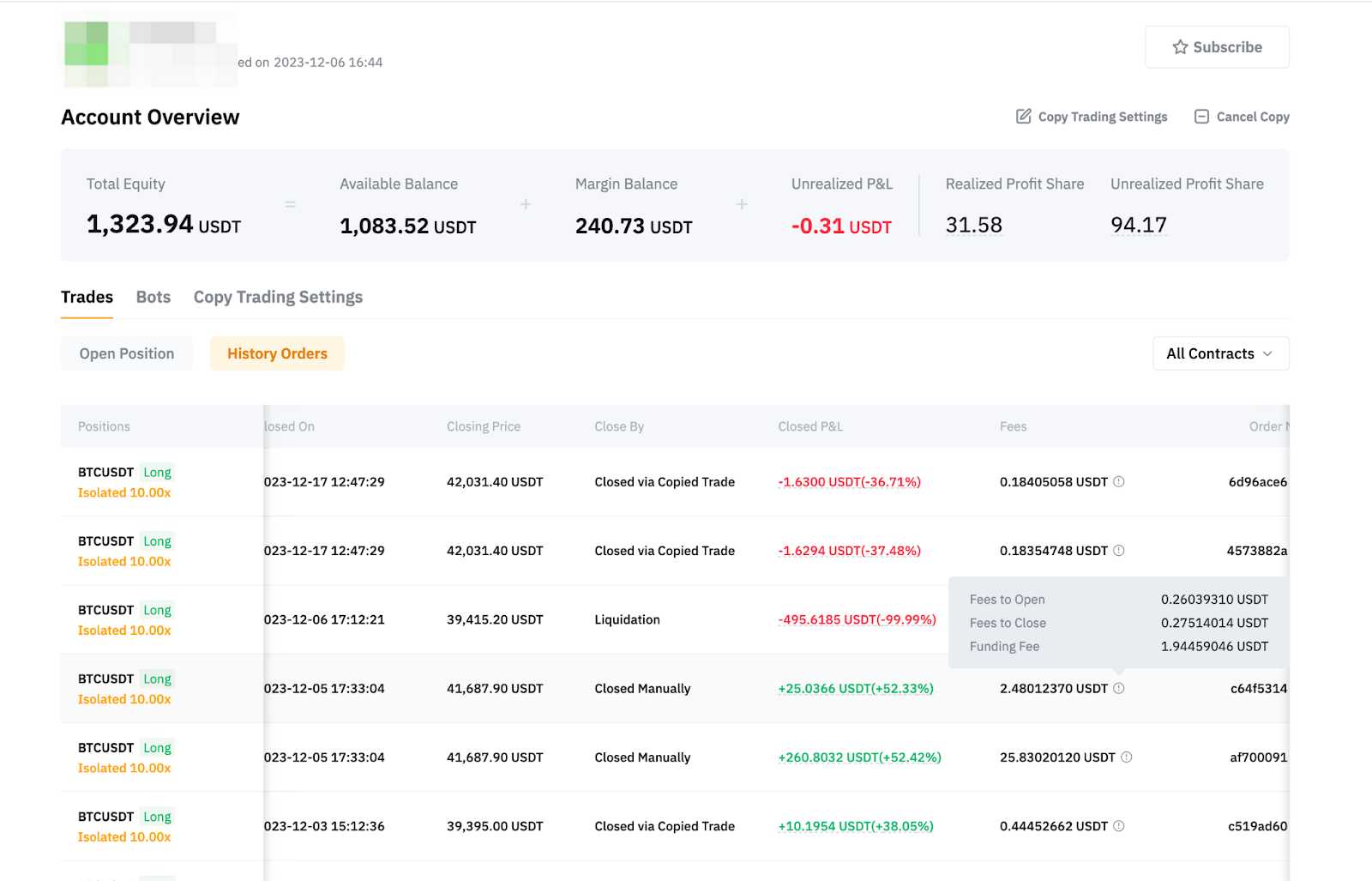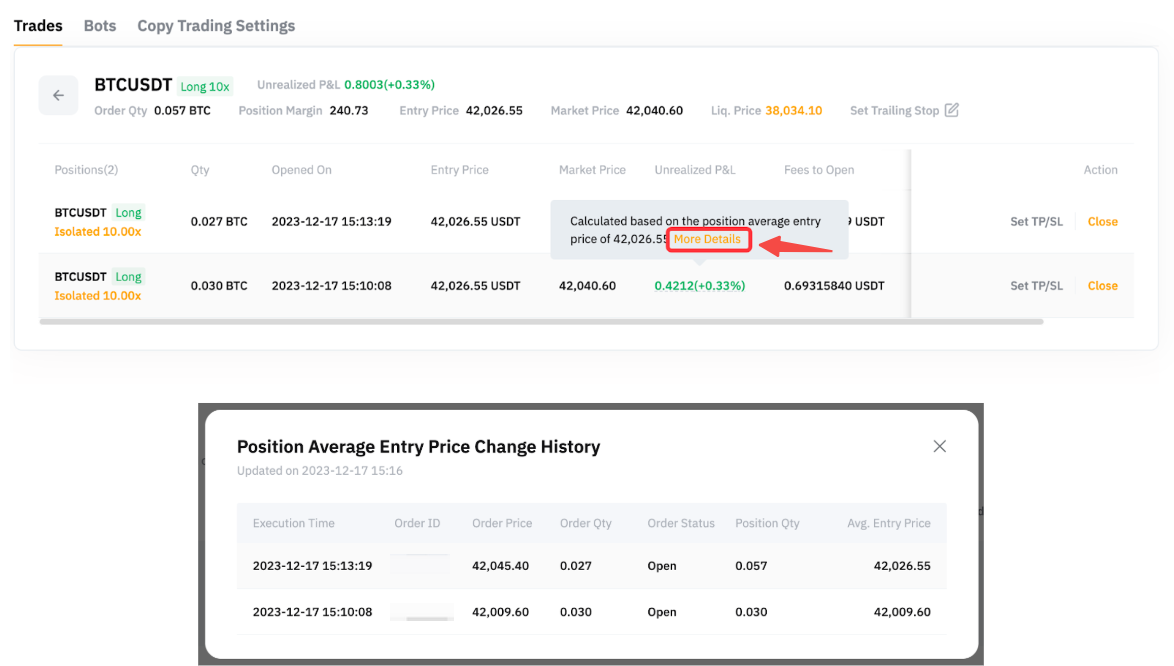 Di bawah Detail posisi, Anda bisa melihat detail setiap pesanan yang disalin untuk posisi tersebut. Harap dicatat bahwa Harga Masuk yang ditampilkan dalam detail posisi adalah harga masuk rata-rata posisi. Untuk memeriksa bagaimana harga masuk posisi tersebut diperoleh, Anda dapat mengarahkan kursor ke Laba Rugi Belum Terealisasi dan klik Detail Selengkapnya untuk melihat Riwayat Perubahan Harga Masuk Rata-rata Posisi.