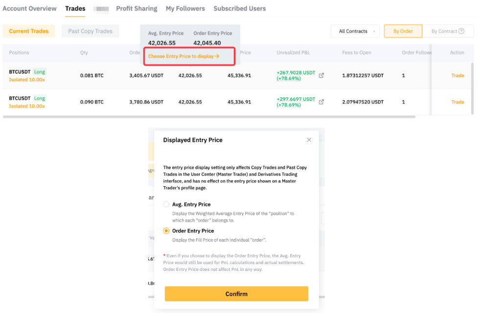 Harap dicatat bahwa Harga Entri yang ditampilkan dalam detail pesanan adalah harga entri rata-rata posisi. Untuk mengubah tampilan pada harga yang terpenuhi pesanan, Anda dapat memindahkan kursor pada harga entri dan memilih Harga Entri untuk ditampilkan.