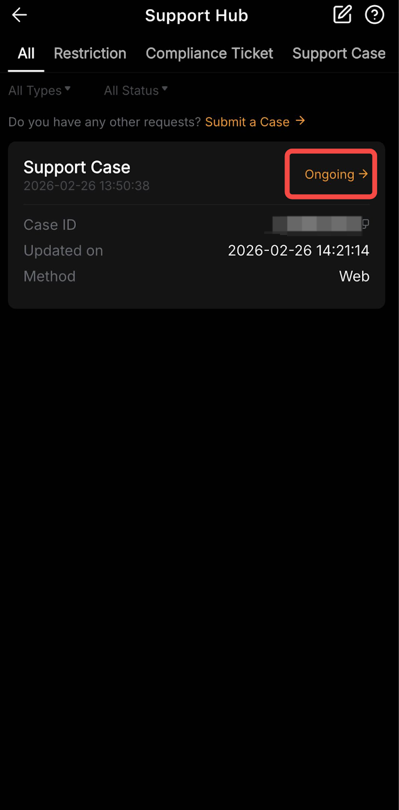 Setelah mengirimkan tiket dukungan, Anda dapat menggunakan Pusat Dukungan Bybit untuk memantau statusnya secara waktu nyata tanpa hanya mengandalkan notifikasi email. Dasbor terpusat ini menampilkan semua kasus Anda yang terbuka dan pembaruan dan memungkinkan interaksi langsung dengan tim dukungan kami.