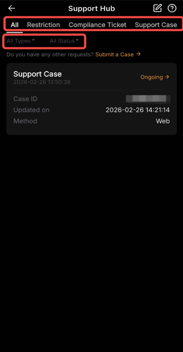 - Tab: Pilih jenis kasus spesifik yang ingin Anda lihat, seperti Deposit, Penarikan, dan Kasus Dukungan, atau pilih Semua untuk melihat semua tiket yang Anda kirimkan.