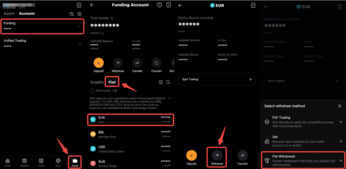 Untuk menarik mata uang fiat Anda, Buka halaman Aset dan pilih Akun Pendanaan, ketuk Fiat dan pilih mata uang fiat yang ingin Anda tarik, tekan Tarik → Penarikan Fiat. Prosedur untuk menarik dana dalam mata uang fiat yang berbeda sedikit berbeda. Untuk detail selengkapnya, silakan kunjungi panduan ini.