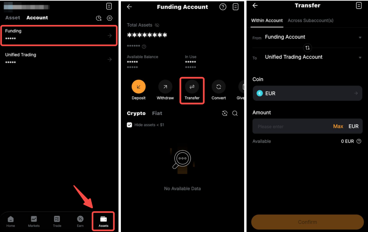 Buka halaman Aset dan pilih Akun Pendanaan. Ketuk Transfer untuk diarahkan ke halaman transfer. Pastikan akun dan mata uang fiat yang dipilih sudah benar, lalu masukkan jumlah yang akan ditransfer. Selanjutnya, klik Konfirmasi.