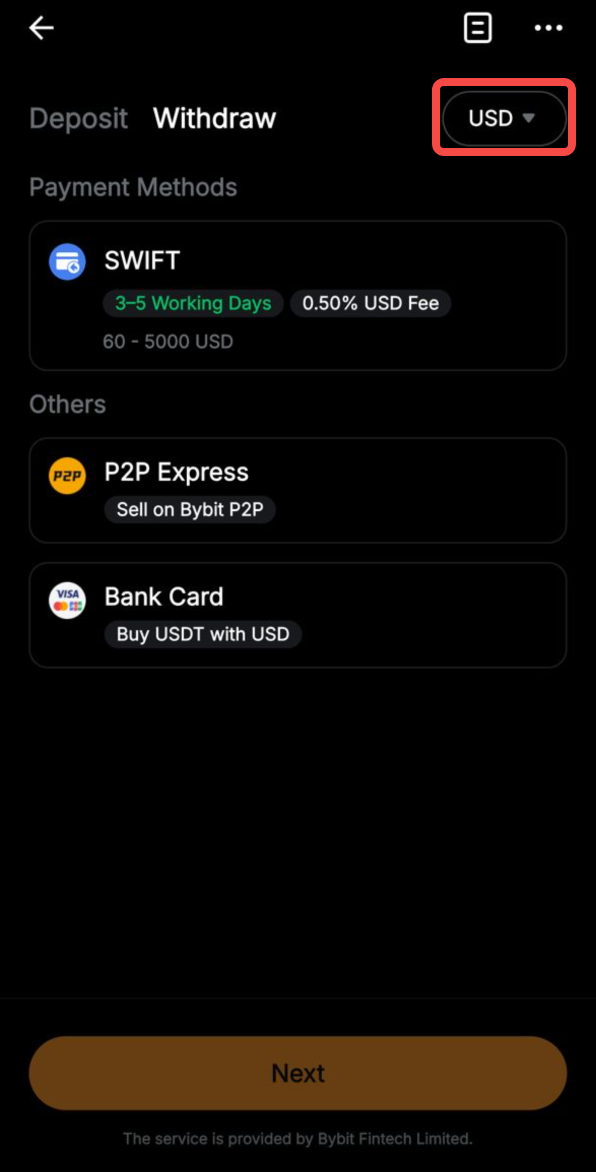 Bybit menyediakan berbagai deposit fiat guna memberi kemudahan bagi Anda untuk berdagang secara instan melalui Saldo Fiat. Namun perlu digaris bawahi, prosedur dalam mendepositkan dana untuk mata uang fiat yang berbeda juga sedikit berbeda. Untuk mendapatkan detail selengkapnya, silakan mengunjungi laman ini.