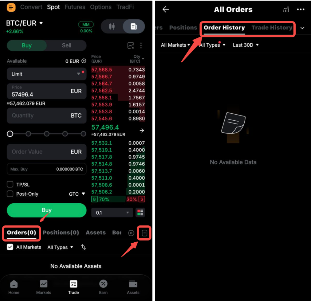 Untuk melihat detail pesanan atau riwayat perdagangan Anda, silakan beralih ke kolom Pesanan Saat Ini, Pesanan Sebelumnya, atau Riwayat Perdagangan di zona posisi.