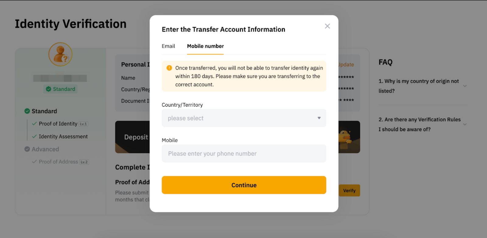 - Setelah menyelesaikan transfer identitas, jika Anda memiliki aset yang tersisa di akun Anda yang lama (yang mana akun tersebut belum terverifikasi), Anda tetap dapat melakukan penarikan atau transfer internal setelah kurun waktu pembatasan penarikan 24-jam. Namun, jika Anda ingin melakukan transfer internal, akun tujuan harus merupakan akun terverifikasi.