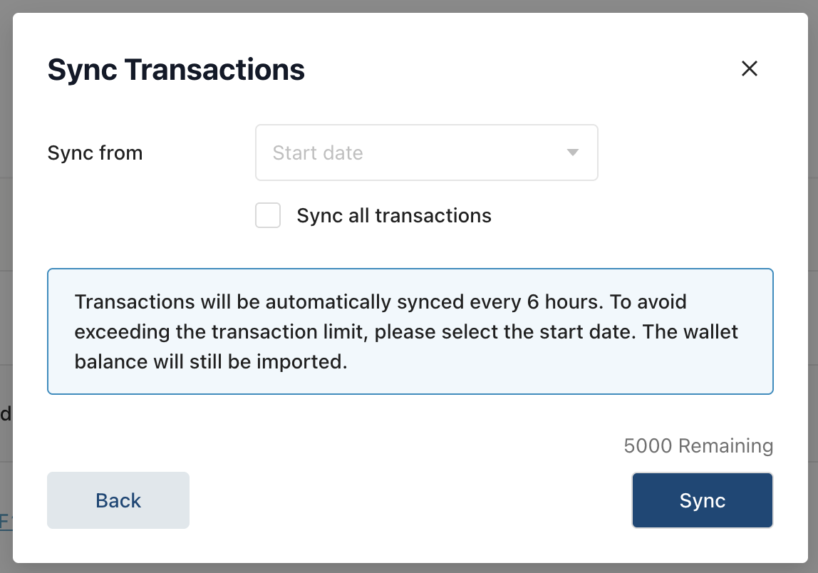 Langkah 7: Setelah terhubung, Journaler akan menanyakan dompet mana yang akan dihubungkan dan memungkinkan Anda memilih tanggal mulai.