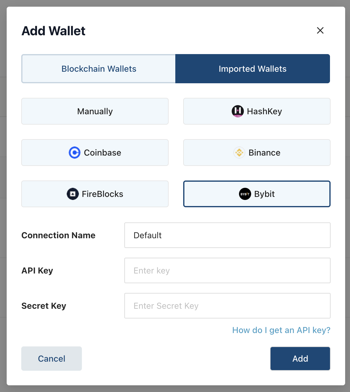 Langkah 6: Di jendela pop-up, pilih Bybit dan masukkan informasi Kunci API Bybit yang baru Anda buat. Anda harus memasukkan: