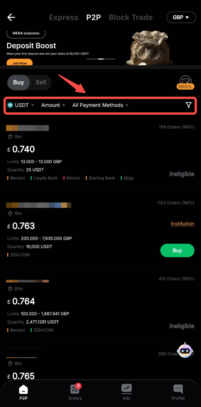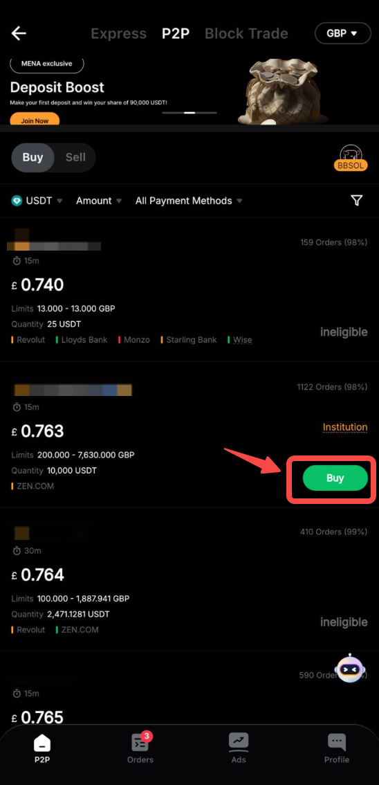 Langkah 3: Pilih pengiklan pilihan Anda dan klik Beli. Pastikan pengiklan yang Anda pilih mendukung pembayaran Saldo Fiat.